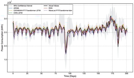 The experimental results show that the ARIMA [28] model performs the worst, with an value of only 0.4082 and relatively large MAE and RMSE values. This indicates that, as a traditional model, ARIMA exhibits weak predictive capability when processing modern electricity data, struggling to capture the complex patterns and long-term dependencies inherent in the data. Compared with ARIMA, both the RNN [29] and CNN-LSTM [30] models show improved performance. In particular, with the CNN-LSTM composite model, the CNN’s convolutional layers can be used to perform multi-scale decomposition of input sequences, thereby facilitating better feature extraction. So, it achieves a significant reduction in MAE. Notably, the prediction performance after wavelet transform [31] significantly improved compared to the previous two models, but the accuracy is still insufficient. However, despite these improvements in prediction accuracy, neither of these models reaches the desired performance level, indicating that they still have certain limitations in handling more complex electricity consumption forecasting tasks.
