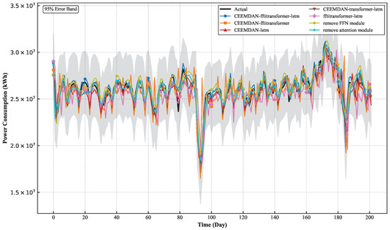 In contrast, the CEEMDAN-FFT-iTransformer-LSTM model significantly outperforms the other models on all evaluation metrics, demonstrating exceptional performance. This model achieves an value as high as 0.9055, far surpassing the other models, which indicates its outstanding model-fitting capability. However, when examining the overall forecast, the model performs poorly in certain sections with lower peak mutations (such as days 90 and 182). This may be due to sudden drops in electricity consumption caused by specific incidents, which disrupted the original daily periodic patterns. But in most cases, its superior performance in terms of MAE, RMSE, and MAPE demonstrates that the model can provide more precise results in predicting electricity consumption data in terms of both identifying outliers and capturing overall trends. Although this model has higher computational complexity, resulting in a single inference time of 691.21 seconds, its improvement in prediction accuracy significantly outweighs the increase in computational cost. Compared to the suboptimal model, our framework achieves a 50.4% reduction in MAE and a 50% improvement in MAPE on daily-granularity data, with only a 38% increase in computation time. This demonstrates that a moderate increase in model complexity can bring significant performance gains in daily prediction scenarios. It is worth noting that daily load forecasting in power systems typically allows for several minutes of computational latency (according to NERC standards [32]), and our model’s real-time performance fully meets practical business requirements. These results fully confirm the strong ability of the CEEMDAN-FFT-iTransformer-LSTM model to capture multi-scale features and complex temporal patterns in electricity consumption data, significantly enhancing both the accuracy and stability of electricity consumption forecasting, and thereby establishing its leading position in electricity time series forecasting tasks.