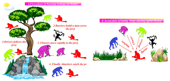 The Chimp Optimization Algorithm (ChOA) is a nature-inspired optimization approach modeled on the hunting strategies of chimps and was introduced by [76]. In a chimp colony, four distinct roles exist: driver, barrier, chaser, and attacker. Despite having diverse abilities, these roles are essential for coordinating efforts to capture prey. Figure 2 illustrates the necessary actions and strategies involved in the hunting process. As illustrated in Figure 2, drivers are responsible for pursuing the prey during the hunting process. Barriers obstruct the prey’s movement by creating obstacles among the tree branches. Chasers focus on catching up with the prey, while attackers predict the prey’s escape path, forcing it back toward the chasers’ position. Collectively, the driver, barrier, and chaser contribute to the exploration stage (stage 1), whereas attackers assume control during the exploitation stage (stage 2) [77].