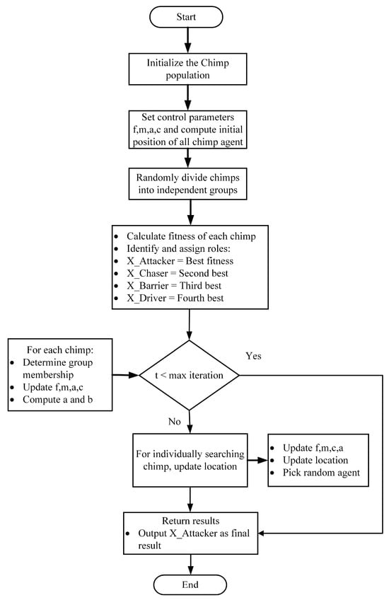 Here, and denote random vectors with constants ranging between 1 and 0, while is a control parameter that decreases non-linearly from 2.5 to 0. The pseudo-code and flowchart of the ChOA are presented in Table 3 and Figure 3.