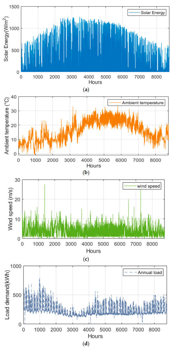 (a) Solar radiation, (b) ambient temperature, (c) wind speed, and (d) load demand.