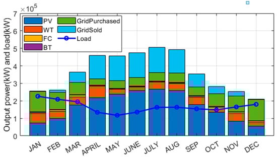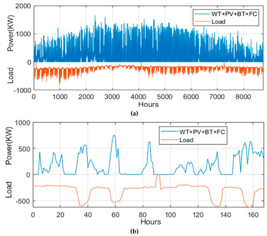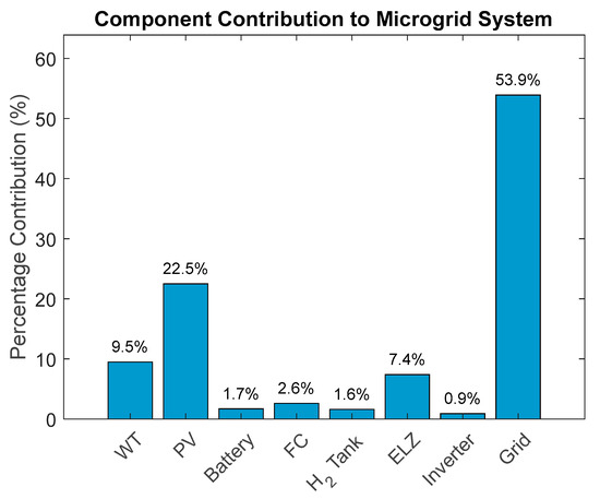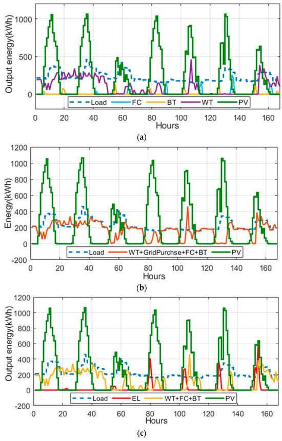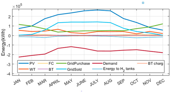 The authors in [26] performed an analysis of a PV/diesel–BAT system to ensure continuous supply of energy for three domestic households’ energy demands in a village in Cameroon. They modeled energy flows using hourly solar radiation data obtained from monthly medians through the Duffie and Beckman method. Their findings indicated that the suggested microgrid could be more economical compared with grid electricity for households located far away from the grid infrastructure. The authors in Ref. [27] conducted a technical and economic analysis across different places in India using six microgrid systems. They identified the WT/PV/diesel/BAT arrangement as the most economical choice for a 1.3 kW maximum load, with a per kWh energy cost of $0.162. Similarly, the authors in [28] optimized a renewable energy-based generation system integrating sources such as PV–WT–MGT, combined heat systems, and fuel cells. This system was designed to meet an average daily electrical demand of 38.7 MWh and a thermal demand of 99.4 MWh, with the PV/FC/EL//BAT unit emerging as the most efficient. In [29], a grid-independent hybrid system consisting of PV–WT–diesel–battery was evaluated using HOMER Pro. Software to assess its technical and economic feasibility for three energy demands across 16 grid isolated areas in Chad. Results highlighted optimal configurations varying by location and user, including PV/BAT, PV/Diesel/BAT, and PV/WT/Diesel/BAT systems, with energy costs ranging from $0.367 to $0.529. Furthermore, the systems demonstrated the potential to cut annual emissions of carbon by 15,670 kg in contrast to diesel generator-based solutions. In Ref. [30], a method for producing steel without fossil fuels was introduced and assessed, where hydrogen was used to directly reduce iron ore. This approach provides significant flexibility in generation and electrical energy usage, contributing to grid stability via hydrogen storage and thermal storage technologies. Nevertheless, additional studies are needed to assess the economic feasibility of these flexible procedures. In Ref. [31], the authors analyzed the technology of power to gas (P2G) as an alternative energy solution for managing the energy output of extensive wind turbine farms connected with the national grid of Europe. Their findings revealed that the power-gas system effectively minimizes energy losses caused by grid congestion. Yet, the use of gas turbines in the process leads to increased carbon dioxide emissions. The authors in [32] explored the optimal configuration for a grid-independent WT–PV–PH energy system, aiming to minimize both the energy cost and supply loss. Their results revealed that combining WT and PV energy offers greater economic benefits than relying on either source independently. The authors of [33] designed an optimal WT–PV–FC energy system to supply electricity to domestic and commercial centers in Iran. They analyzed various hybrid configurations, including PV–FC, WT–FCS, and PV–WT–FC, under different maximum allowable load disturbance possibilities. The findings showed that the PV–WT–FC system was the most economical option, with a minimum life-cycle cost and maximum reliability due to reduced load disturbances, making it a more sustainable choice for these centers. Guo et al. [34] applied an arbitrary optimization method to design a standalone WT–PV–Battery energy system for developing power supply. For the PV–battery optimization, they evaluated different PV panels, such as mono, poly, and thin-film, and compared the results to those of WT–BES systems. Based on economic, technical, and environmental considerations, the polycrystalline–PV–battery system emerged as the most suitable solution for the proposed location.