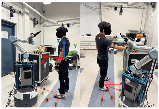 This study employed a UR5 robot (Universal Robots, Odense, Denmark) and a Fetch mobile base (Fetch Robotics, San Jose, CA, USA) as the cobot assistant to support plant-transplanting tasks (Figure 1). The UR5-based setup was used as the proxy of the Stickbug robot [21], with comparable dimensions and major design features, and was operated as the Wizard of Oz method. In this study, the cobot was operated without autonomous motion planning. While the robot did not execute real-time path planning, its pose and positioning were selected to reflect plausible ergonomic placements. The biomechanical data collected here will inform future control strategies that can adapt robot trajectories to minimize dynamic spinal loading and maximize human comfort.