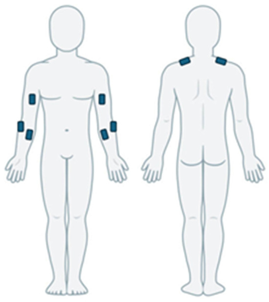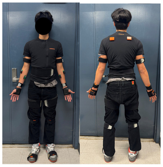 Upon arrival, participants were briefed on the study’s objectives and procedures before providing informed consent. Seventeen inertial measurement unit (IMU) sensors were then positioned on each participant following the manufacturer’s guidelines, as shown in Figure 2. Anthropometric data were collected, and participants underwent a calibration process using the Xsens MVN Analyze/Animate software (Version 2021.0.1). Calibration consisted of a static pose held for five seconds, followed by a brief walking sequence to ensure precise motion capture alignment. Next, Trigno EMG sensors were attached to the participants, as shown in Figure 3, to measure muscle activity. The maximum voluntary contraction (MVC) of each muscle was assessed following established guidelines [22] to normalize muscle activation data across individuals.