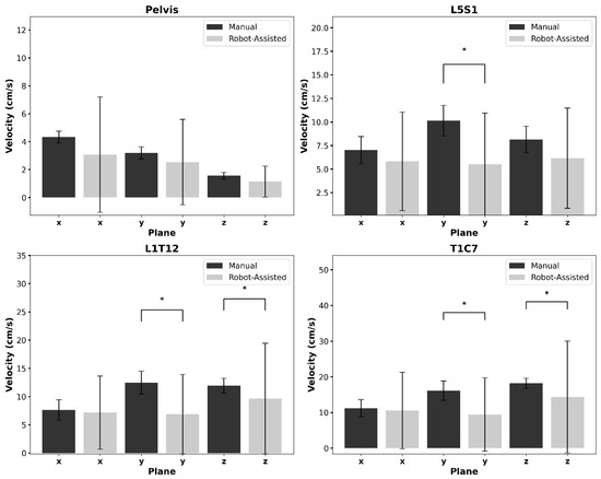 Cobot assistance significantly reduced segment velocities across key spinal regions, with notable differences observed in the L5/S1, L1/T12, and T1/C7 joints (Table 2, Figure 4). At the L5/S1 joint, velocity in the y-axis decreased significantly from 10.1 to 5.5 cm/s (F = 8.207, p = 0.006), with no significant differences in other axes. L1/T12 exhibited significant reductions in the y-axis velocity from 12.5 to 6.9 cm/s (F = 7.561, p = 0.01), and from 11.9 to 9.7 (F = 5.973, p = 0.017) cm/s in the z-axis, while no significant changes were noted in the x-axis. At T1/C7, the velocity in the y-axis decreased significantly from 16.1 to 9.4 cm/s (F = 6.987, p = 0.011), and the z-axis velocity showed a significant reduction from 18.2 to 14.3 cm/s (F = 14.150, p < 0.001). At the pelvis, the mean velocity in all three axes decreased but the values showed no significant differences.