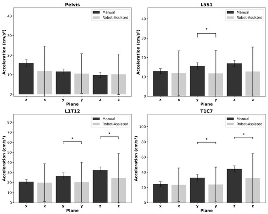 The effects of cobot assistance on segment acceleration were similar across spinal regions (Table 3, Figure 5). At the L5/S1 joint, the y-axis showed a significant reduction from 15.6 to 11.8 cm/s2 (F = 6.872, p = 0.005), with no significant changes in the x- and z-axes. At L1/T12, acceleration decreased significantly in the y-axis from 26.6 to 20.3 cm/s2 (F = 7.143, p = 0.001) and in the z-axis from 32.5 to 24.4 cm/s2 (F = 4.752, p = 0.027), while the x-axis remained unchanged. At T1/C7, significant reductions in acceleration were observed in the y-axis from 32.7 to 24.0 cm/s2 (F = 7.068, p = 0.005) and in the z-axis from 44.5 to 32.3 cm/s2 (F = 12.670, p = 0.001), with no significant changes in the x-axis. At the pelvis, the mean acceleration in all three axes showed no significant differences.
