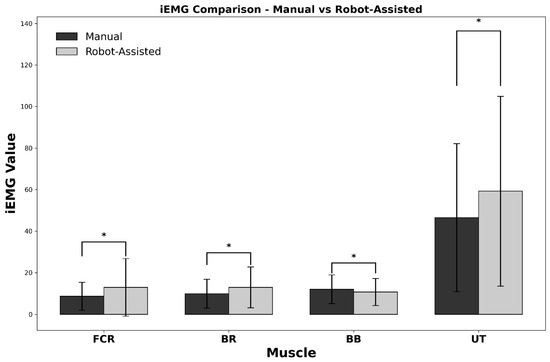 Cobot assistance led to a significant reduction in the activation of the BB muscle during stooping, decreasing from 12.09 µV (±6.9) to 10.72 µV (±6.5) (F = 6.29, p = 0.018). Conversely, activation significantly increased with cobot assistance for the FCR muscle (8.71 to 12.97 µV, F = 7.15, p = 0.012). Similarly, for the BR muscle, activation increased significantly (9.93 to 13.0 µV, F = 7.4, p = 0.01). For the UT muscle, significant increases were observed from 46.5 to 59.23 µV (F = 11.233, p = 0.002) (Table 4, Figure 6).