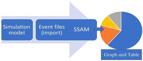 The surrogate safety assessment model (SSAM) was created by Siemens ITS and financed by the Federal Highway Administration (FHWA). By analyzing trajectory data provided by traffic microsimulation techniques like VISSIM, PARAMICS, TEXAS, and AIMSUM, the SSAM was developed to automate the procedure of traffic conflicts []. The SSAM functions as a post processor, classifying conflicts and using a trajectory file (trj) to calculate a few surrogate safety precautions generated by the microsimulation tools. The SSAM creates a database of each instance found in the model output after analyzing trajectory files with vehicle-to-vehicle interaction to find conflict scenarios [,]. Figure 1 depicts a concept of the SSAM.