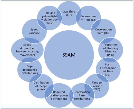 To meaningfully assess the chance and/or severity of an accident, surrogate safety measures (SSMs) are measurements that indicate the association between two road users during a traffic occurrence. There are numerous SSMs used in traffic simulation studies to assess the safety impact. The utmost common SSMs derived from traffic microsimulation and their definition given by the FHWA (2003) [] are presented below in Figure 2.