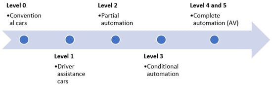 In comparison with other microsimulation platforms, VISSIM has been more widely used in assessing the influence of AVs on traffic flow at intersections, interchanges, and roundabouts using built-in models. According to recent research studies conducted using PTV VISSIM, AVs would help transport networks in several ways. These advantages include reduced traffic congestion, enhanced safety, better traffic flow, and greater traffic capacity for the existing road infrastructure [,]. Based on how the human driver and the vehicle technology coordinate the driving task, the Society of Automotive Engineers has divided automated cars into six levels of automation. As shown in Figure 4, in the first three levels, the primary driving tasks are performed by the human driver. Conversely, however, Levels 4 and 5 indicate total automation [].