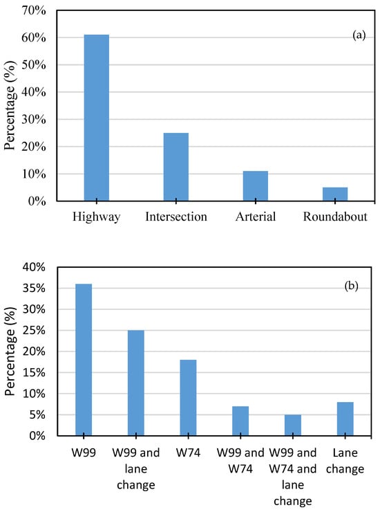 The fundamental element of VISSIM microsimulation is driving behavior. Highways, which significantly affect traffic operations, were the subject of 60% of the investigation, as Figure 5a,b illustrates. W 99, on the other hand, was utilized by 36% since it contains metrics that show a thorough comprehension of the traffic situation. However, W 99 did not adequately depict traffic problems associated with unusual driving behavior, including forced driver movements that can cause conflict. VISSIM’s lane-change model identifies traffic features that lead to constant changes of lanes. There are issues with the W 99 lane-change model that must be resolved. Driving-behavior simulation could enhance the understanding of lane-change risk and result in more successful road safety programs on rural or small city roads or freeways.