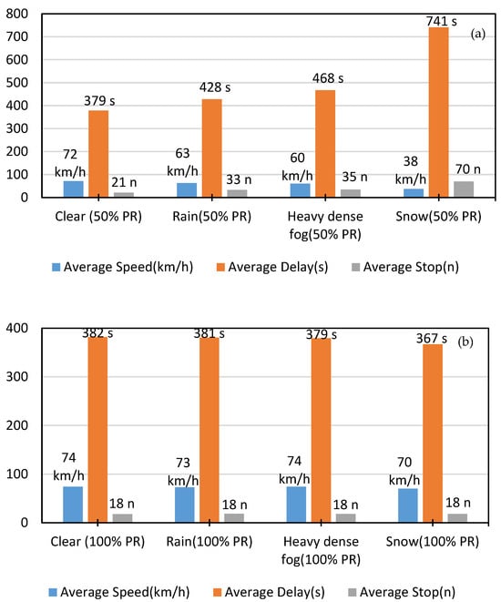 Various levels of automated vehicle adoption under clear sky, rain, heavy dense fog, and snow with (a) 50% and (b) 100% penetration rate.