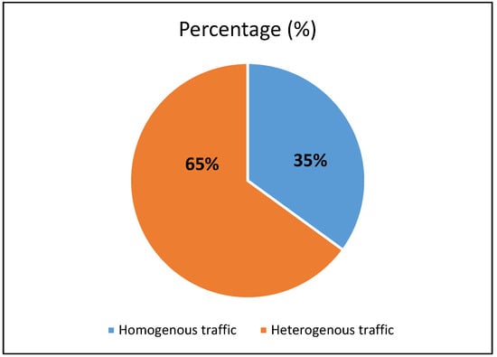 Traffic flow dynamics are determined by competitive traffic streams with different features that arise from different vehicle behaviors and driver preferences. In a multimodal system, for instance, vehicles, transit fleets, and trucks all share rights-of-way. Different travel lanes, desired speeds, and safety distances are needed for the various vehicle characteristics. Additionally, drivers might exhibit a variety of driving behaviors that can complicate traffic dynamics, like maintaining gaps when chasing a leading car, using brakes repeatedly, and changing lanes continuously. In the same way, real-world traffic flow frequently exhibits variation []. The main difference among homogeneous and heterogeneous traffic systems is that the former are mostly caused by the various operational and performance features of automobiles. Figure 7 demonstrates the use of homogenous and heterogenous traffic flows in VISSIM. About 65% of previous researchers used heterogenous traffic flow in VISSIM, while 35% of the literature is based on homogenous traffic flow.