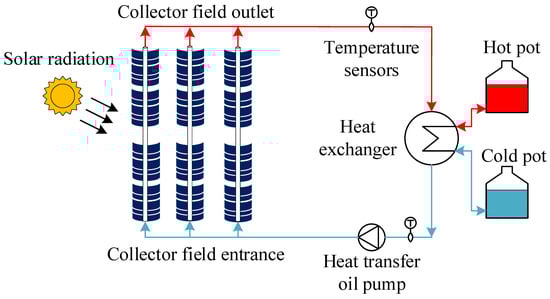 Figure 2 illustrates the system structure of a PTSF. The thermal energy collection device consists of several parallel absorber tubes and parabolic reflectors. The tube absorbs solar radiation, and the circulating oil transfers it to the heat exchanger.
