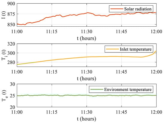 The simulation data simulate the possible variations in solar radiation, input temperature, and environment temperature from 11:00 to 12:00 noon, as shown in Figure 3. The total sampling step is , and we select the first 800 steps as part of the presentation.
