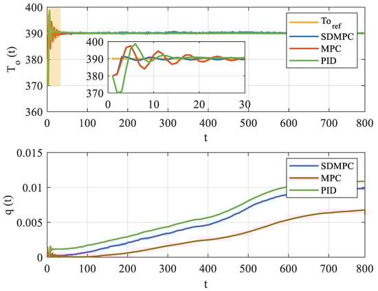 The upper part of Figure 4 compares the outlet temperature control performance of the proposed SDMPC (blue curve), traditional MPC (red curve), and PID controller (green curve). The above three methods successfully track the reference temperature, increasing from an initial value of 380 °C to a steady-state value of 390 °C. As highlighted in the zoomed-in subplot, the SDMPC (blue curve) achieves a faster response and converges to the reference temperature (yellow curve) earlier. Meanwhile, the PID controller (green curve) exhibits more pronounced oscillations during the initial transient phase, and the baseline MPC method (red curve) shows certain oscillatory behavior. The lower part of Figure 4 shows the variation in the heat transfer oil flow rate. The control strategies show similar trends in flow rate adjustment. Comparing the results of experiments, it was demonstrated that the proposed SDMPC effectively tracks the outlet temperature and outperforms the baseline methods during the stabilization process.