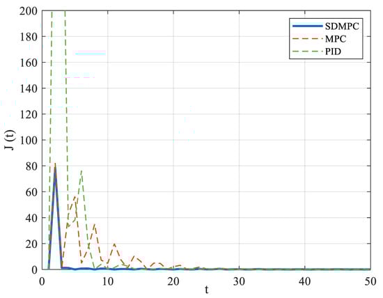 In addition, the performance index comparison in Figure 5 shows that the step cost of SDMPC (blue curve) remains consistently closer to zero than PID (green dashed curve) and the basic MPC (red dashed curve). The results also directly demonstrate the superior stabilization performance of the proposed SDMPC. To further validate this result, a Monte Carlo simulation was conducted. We repeated trials 500 times to obtain statistical variance, aiming to minimize randomness and enhance the reliability of the performance evaluation. The averaged performance indices are reported in Table 2. In conjunction with Figure 4 and Figure 5, it is also straightforward to conclude that the SDMPC achieves faster convergence to the desired temperature with a small overshoot, demonstrating stability and tracking capability.