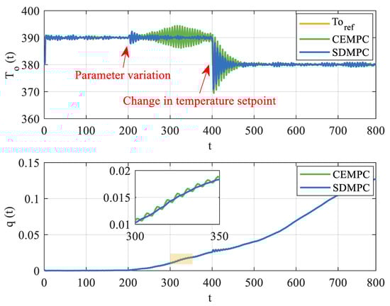 In this experiment, parameter variations and outlet temperature setpoint changes are introduced. Two disturbances are applied to the system at time instances s and s, respectively. For , the system parameters are defined as . At , the parameters abruptly switch to . Following this, at , the outlet temperature setpoint is adjusted from 390 to 380 °C.