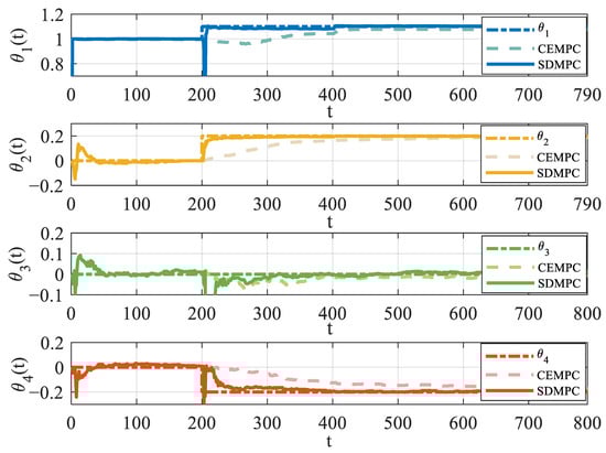 In Figure 7, the dark dashed line represents true values. The bold solid line represents SDMPC, while the lighter dashed line corresponds to CEMPC. Different colors represent different parameter elements in turn. Taking (blue) as an example, at the time s, the SDMPC’s estimate (blue solid line) quickly converges to the true value (dark blue dashed line) via the real-time update of Kalman filter. In contrast, CEMPC’s estimate (light blue line) fails to identify the true parameters even after 100 steps. When the setpoint changes at s, the SDMPC has acquired sufficient knowledge to allow exit temperature tracking. Also, due to the increase in output error, learning is triggered again. The yellow, green, and red curves exhibit the same characteristics.