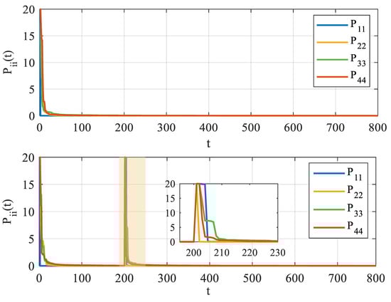Figure 8 illustrates the variance (the diagonal elements of ). The upper subplot represents CEMPC, which conducts parameter learning solely at the initial time ( s), without further adaptation thereafter. But in the lower subplot, representing SDMPC, it can be visualized that at s and s two peaks occurred. The second peak in indicates that SDMPC introduces an exploratory signal into the control inputs, accelerating the learning process of the parameters. This observation is consistent with Figure 7, illustrating the exploration and adjustment process of SDMPC under two different perturbations.