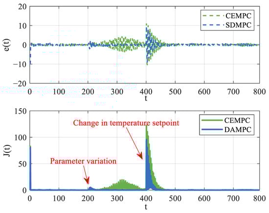 Figure 9 shows the variation in outlet temperature error and the control performance index. Both disturbances induce significant fluctuations in the output error. The error of SDMPC (blue dotted line) between 200 s and 400 s is significantly smaller than that of CEMPC (green dotted line). Correspondingly, there are two increases in control performance (in the lower part of the Figure 9) observed, which is due to incorrect system parameters and large output errors. In conclusion, the SDMPC activates its exploration mechanism at the time of perturbations. SDMPC is better than CEMPC in terms of the ability to cope with parameter changes. The advantages are essential for long-term stability in solar collector control systems by mitigating parametric drift and cumulative errors.