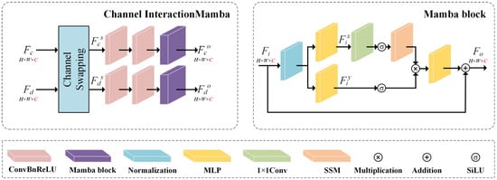 In dual-modal object tracking method [], a channel swapping mechanism has been employed to enable lightweight feature interaction, and a richer and more diverse set of shallow features for subsequent deep feature extraction are provided. Meanwhile, mamba achieves global modeling with linear complexity and demonstrates outstanding performance across various tasks [,]. Inspired by these advances, this paper proposes a channel interaction mamba (CIM), as illustrated in Figure 4 and Figure 5, aiming to enhance watermarking performance while maintaining network efficiency. The proposed module strengthens the interaction between cross-modal features through channel exchange and leverages the global modeling capability of mamba to optimize the representation of RGB and depth features for improving overall watermarking performance.