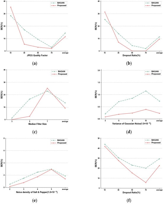 Firstly, the training noise was analyzed. JPEG is a common image compression attack. The proposed CIMGAN showed a lower average BER under this attack. Notably, robustness is weak only when the quality factor is set to 10, which confirms the CIMGAN’s strong robustness to JPEG compression attacks and its enhanced capability to accurately extract the watermark. Dropout randomly eliminated partial watermark information in certain pixels and impeded the effective extraction of the watermark. BAGAN [] outperformed under lower Dropout coefficients, while the CIMGAN exhibited superior robustness under common attack intensities. Regarding the Median Filter, the CIMGAN maintained lower average BER values overall, with performance degradation only occurring under a 7 × 7 window size. Comprehensive experimental results demonstrate that the CIMGAN possesses enhanced interference robustness against training noise attacks, meeting practical application requirements.