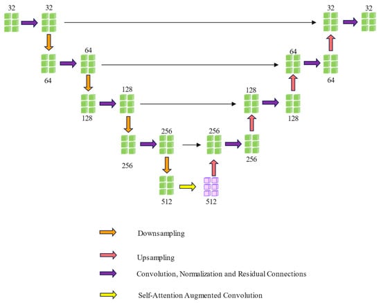 This diagram illustrates the Transformer-enhanced U-Net architecture designed for multi-scale feature fusion. The encoder pathway (left side) progressively reduces spatial resolution while increasing feature channels from 32 to 512 dimensions through a series of ResBlocks. At the bottleneck, the 512-dimensional feature layer incorporates a Transformer module where each voxel representation is treated as an independent token, enabling global information exchange across different spatial locations. The decoder pathway (right side) gradually recovers spatial resolution while reducing feature dimensions back to 32 through UpBlocks. Skip connections (horizontal paths) link corresponding encoder and decoder layers, preserving detailed geometric information throughout the feature extraction process. This architecture combines the advantages of U-Net’s multi-scale feature representation with Transformer’s global modeling capability, creating a comprehensive feature extraction framework that captures both fine-grained details and long-range dependencies in point cloud data, as shown in Equation (4):