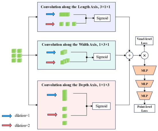 As shown in Figure 4, the fused features are supervised by the voxel-level classification loss and simultaneously fed into a point-level classification network consisting of a three-layer MLP. This design enables the module to learn feature representations at both voxel and point cloud levels simultaneously. At the voxel level, the three-way convolution is designed to effectively capture spatial structural information in different directions; at the point cloud level, the multi-layer MLP network can further extract and refine the features, and finally output point-level semantic segmentation results. This multi-scale and multi-level feature learning strategy enables the model to better handle the geometric details and semantic information in the point cloud data and improve the segmentation accuracy.