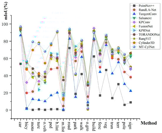 The results of testing the proposed method on SemanticKITTI [20] are shown in Figure 5 and Table 2. As shown in Figure 5, through quantitative analysis, MT-CylNet exhibits good classification ability when dealing with both dynamic targets (e.g., motorcycles, bicycle riders) and static structures (e.g., roads, vegetation), which demonstrates its generalization performance in complex scenarios.