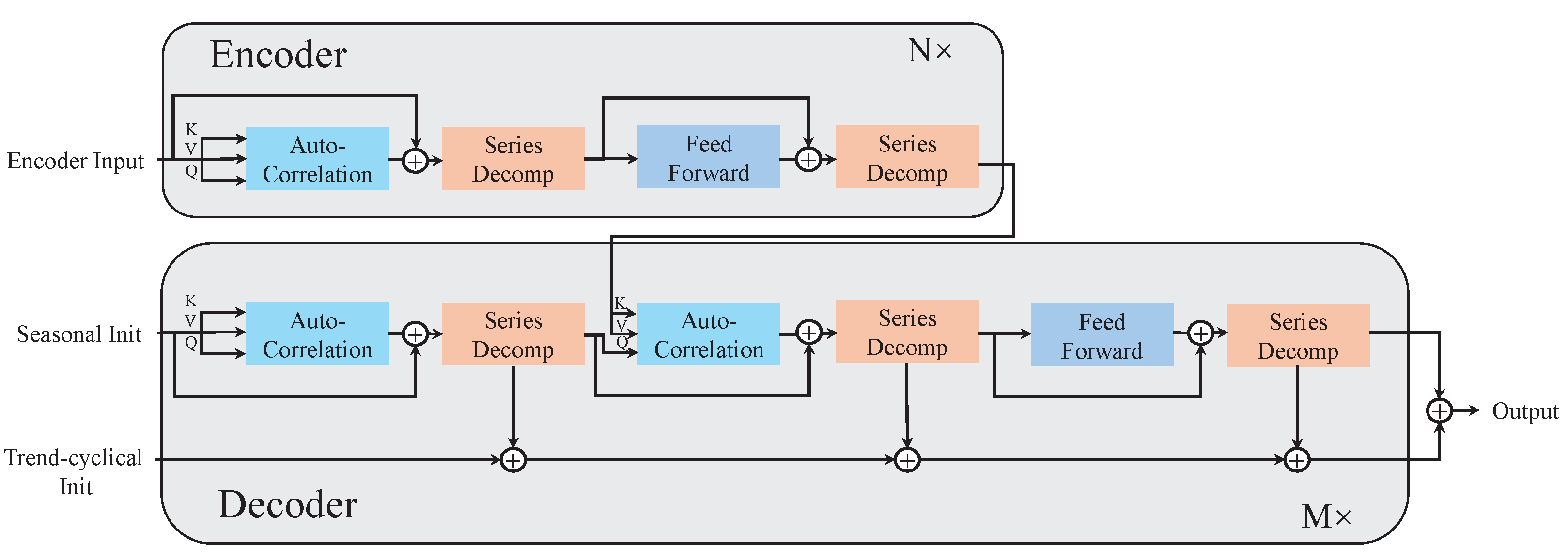 The decoder consists of two parts: a cumulative operation for trend components and a stacked autocorrelation mechanism for seasonal components. Assuming that there are M decoding layers, using the latent variables from the encoder, the equations for the l-th decoder layer can be summarized as . The internal details are as follows: