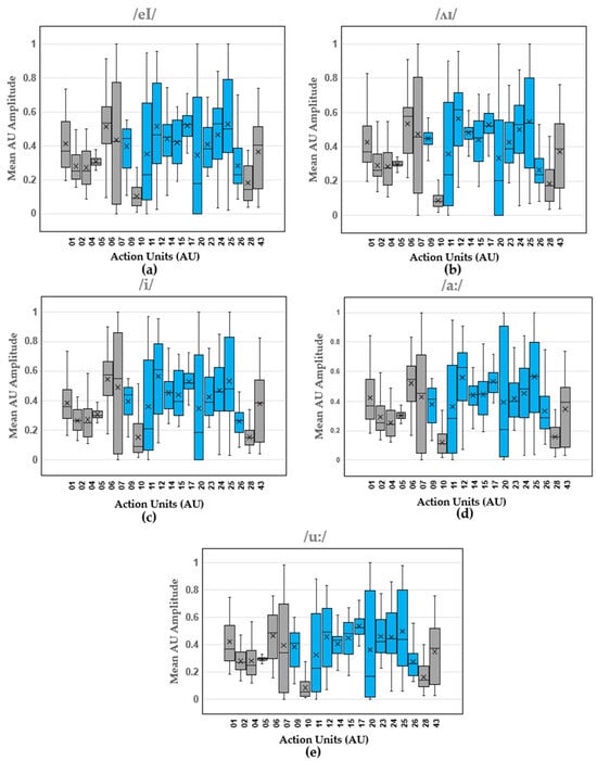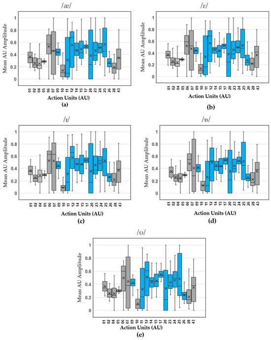 Vowel AU amplitude boxplots (median, upper and lower interquartile range (IQR), and standard deviations pooled across participants) for (a) /æ/, (b) /ε/, (c) /ɪ/, (d) /ɒ/, and (e) /ʊ/). Blue boxes indicate AUs specifically related to speech, while gray boxes represent AUs not associated with speech.