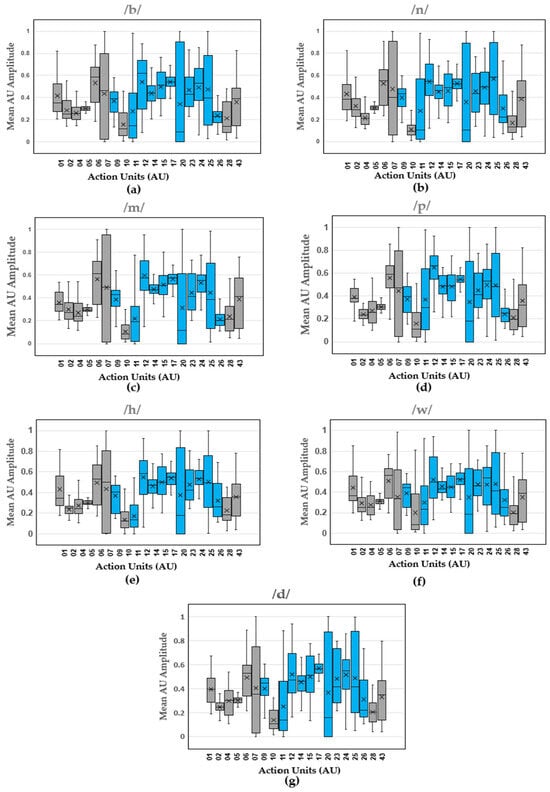 Consonant AU amplitude boxplots (median, upper and lower interquartile range (IQR), and standard deviations pooled across participants) for (a) /b/, (b) /n/, (c) /m/, (d) /p/, (e) /h/, (f) /w/, and (g) /d/. Blue boxes indicate AUs specifically related to speech, while gray boxes represent AUs not associated with speech.