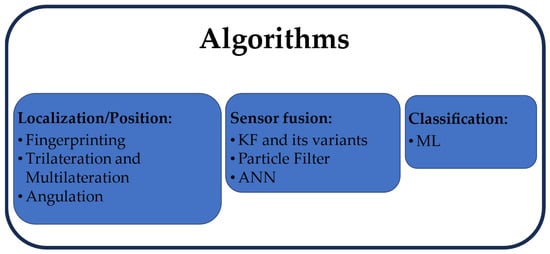 The rest of the paper is organized as follows. In Section 2, the main sensors and techniques used in the field of localization are presented; Section 3 presents the algorithms for position estimation and the main algorithms adopted in fusion-based systems, including Neural Networks (NN), which are used for different purposes; Section 4 reports the summary tables, which include the obtained accuracies of the investigated technologies and their environmental application; Section 5, which reports the conclusions.