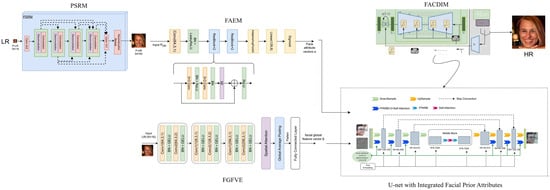 As novel generative models, diffusion models have achieved remarkable success in image generation. Compared to GANs, they offer more stable training, higher-quality samples, and greater diversity. Conditional diffusion models introduce condition information, like low-resolution images, into diffusion and reverse diffusion processes to guide image generation. In super-resolution tasks, these models typically take low-resolution images as conditional inputs to learn the low to high-resolution mapping. Saharia introduced SR3 [21], which achieves super-resolution through repeated refinement. SR3’s success highlights the potential of diffusion models in super-resolution, especially at high magnifications. The iterative nature of diffusion models allows for gradual detail refinement, aiding in the recovery of high-frequency information. Implicit diffusion models, which integrate implicit neural representations with diffusion models for continuous super-resolution, operate in a continuous space rather than traditional models’ pixel or discrete latent space. S. Gao proposed the Implicit Diffusion Model (IDM) for high-fidelity continuous image super-resolution [22]. IDM combines implicit neural representations and denoising diffusion models in an end-to-end framework, using implicit neural representations during decoding to learn continuous resolution representations. The proposed method enables the generation of super-resolution images at any resolution without the need for retraining, which is crucial for practical applications where different resolutions may be needed. Traditional diffusion models require hundreds of sampling steps, resulting in low generation efficiency. To speed up diffusion models’ inference, researchers have developed various accelerated sampling techniques, such as DDIM and PNDM. These methods can reduce the number of sampling steps in diffusion models, thus speeding up the inference process. For instance, Yue proposed ResShift, an efficient diffusion model for image super-resolution that significantly reduces the number of diffusion steps through residual shifting [23]. In addition to accelerated sampling techniques, some research focuses on optimizing the network architecture and training methods of diffusion models to boost their efficiency and performance. For example, Xiao introduced EDiffSR, an efficient diffusion probabilistic model for remote sensing image super-resolution [24]. EDiffSR’s EANet uses simplified channel attention and basic gating operations to achieve good noise prediction with a low computational footprint. These acceleration and optimization methods are crucial for promoting the practical application of diffusion models. However, they fail to effectively integrate facial attribute priors, resulting in uncontrolled generation outcomes (such as the inability to adjust age or expression directionally).