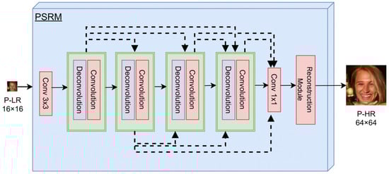 • Hierarchical Feature Enhancement Architecture: Pre-super-resolution module (PSRM)—for extremely low-resolution inputs (e.g., 16 × 16), it performs preliminary feature enhancement through a lightweight residual network, alleviating the detail recovery pressure on subsequent modules.