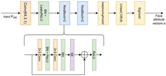 First, adjust to fit the 64 × 64 input size. Change the conv kernel from 7 × 7 to 3 × 3, and stride from 2 to 1 to prevent premature downsampling of the 64 × 64 input. Remove the first MaxPool layer to avoid excessively low feature map resolution, suitable for small-image feature extraction. Reduce parameters to lower overfitting risk while keeping key feature extraction ability. The literature [28] indicates that adding BN layers in super-resolution networks can slow training, cause instability, and create artifacts. To ease this, apply a pre-activation module (BN and LeakyReLU) after the first convolution. This facilitates the optimization of deeper networks [29] and helps to minimize overfitting. The literature [30] suggests SENet, which fuses channel-wise info via weights to suppress irrelevant features. Add SE modules in residual blocks to boost responses in key channels, enhancing the model’s focus on attribute-related regions (e.g., mouth for “smile”, eyes for “glasses”).