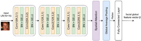 This section introduces an enhanced low-resolution image encoder (FGFVE) for super-resolution tasks driven by conditional diffusion models. Based on a multi-stage CNN architecture with spatial attention mechanisms, the encoder extracts robust global and local features from 16 × 16 facial images, focusing on key areas, like the eyes, nose, and mouth, while maintaining lightweight computation for high-semantic conditional information for subsequent diffusion models. Figure 4 shows a structural diagram of the facial global feature vector encoder.