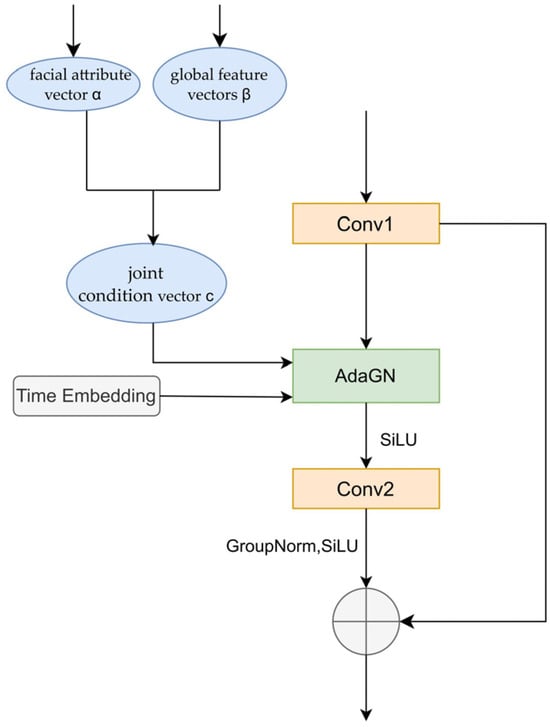 This study presents FACDIM (Facial Attributes Conditional Diffusion Implicit Model), a conditional diffusion implicit model that integrates facial attributes as prior knowledge for face image super-resolution. The model takes 16 × 16 low-resolution images, facial attribute vector α , and global feature vectors β as inputs, and generates 128 × 128 high-resolution face images. It uses Adaptive Group Normalization (AdaGN) to combine facial attribute and global feature vectors as prior knowledge [32] and employs skip connections to concatenate low-resolution features and attribute vectors at multiple levels. FACDIM uses a modified U-Net with Feature Prior Residual Blocks (FPARB), replacing the original convolutional layers, and injects the facial global feature vector β and facial attribute vector α from FGFVE and FAEM into each FPARB block via AdaGN. The encoder processes 16 × 16 images and outputs a global feature vector. The facial attribute vector from the prior attribute extraction module is mapped to 64 dimensions via a fully connected layer.