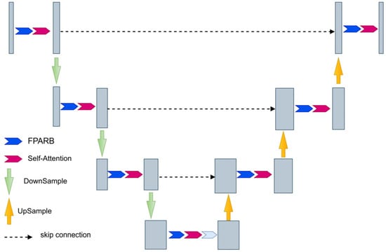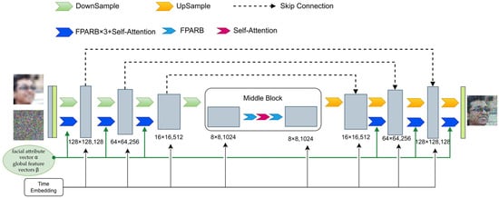 The encoder comprises stages with three FPARB modules and one self-attention module. The FPARB modules incorporate facial attribute and global feature vectors to enhance feature learning and capture global information and long-range dependencies. Each FPARB module consists of two 3 × 3 convolutions and a 2 × 2 average pooling layer, with downsampling modules in each stage to reduce spatial size. Conversely, the decoder progressively restores the compressed features from the encoder. Figure 7 shows a structural diagram of the Improved U-net structure.