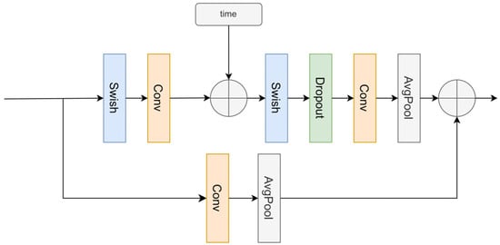 U-Net is suitable for diffusion models due to its ability to produce outputs with the same dimensionality as inputs. In the FACDIM model’s modified U-Net structure, the original convolutional layers are replaced with Feature Prior Residual Blocks as shown in Figure 6. Each major layer contains several of these sub-modules, and deeper layers are followed by self-attention modules. Unlike the original model, each sub-module’s output in the downsampling part of a major layer is additionally fed into its symmetric upsampling sub-module, reducing information loss during downsampling.