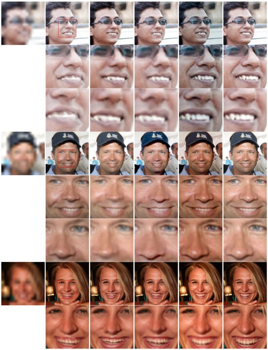 Convolutional Neural Networks (CNNs) have achieved significant success in image super-resolution due to their powerful feature extraction and non-linear mapping capabilities. Early CNN-based methods, such as SRCNN [6], pioneered deep learning to image super-resolution tasks. Subsequent research has led to substantial improvements in network architecture and training strategies, resulting in more advanced models, like VDSR [7], DRCN [8], and EDSR [9]. To better restore facial texture details, Chen proposed the Spatial Attention Residual Network (SPARNet) [10], which incorporates a Facial Attention Unit (FAU) using spatial attention mechanisms. The use of convolutional layers enables adaptive focus on important facial structural regions while minimizing attention on areas lacking distinctive features, thereby improving the reconstruction of facial details. Chen further developed SPARNetHD by combining SPARNet with a multi-scale discriminator, enabling the generation of higher-quality facial images at 512 × 512 resolution with good generalization on low-quality facial images. G. Gao introduced the CNN-Transformer Collaborative Network (CTCNet) to improve network performance by considering global and local facial features [11]. CTCNet features a multi-scale connected encoder–decoder structure and a Local–Global Feature Collaboration Module (LGCM) containing a Facial Structure Attention Unit (FSAU) and Transformer modules. This design aims to enhance the consistency of local facial details and global facial structure recovery. However, traditional CNN-based super-resolution methods have limitations in facial image super-resolution tasks. They are mostly generic image super-resolution models that do not fully utilize facial image’s unique structure and prior knowledge of facial images. These methods often use pixel-level Mean Squared Error (MSE) or Peak Signal-to-Noise Ratio (PSNR) as optimization objectives. While these metrics may improve objectively, the resulting facial images can appear overly smooth and lack realistic high-frequency details.