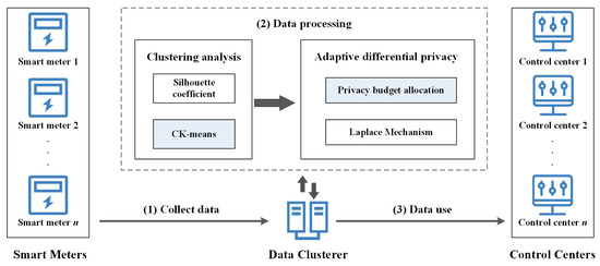 In this paper, smart meters transmit users’ electricity consumption data to the electric company’s control centers periodically or in real-time. The data clusterer collects the electricity consumption data transmitted from the smart meters, performs clustering analysis and privacy protection, and then sends the noise-added clustering results to the control centers. The control centers can use the clustering results for billing, optimizing power services, and other value-added services, enhancing the intelligence level of smart meter applications in urban settings.