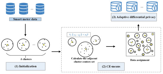 K-means, as a commonly used clustering method, has been widely applied in data analysis for smart meters. However, this method requires repeatedly computing the similarity between all data points and cluster centers in each iteration, which leads to high computational overhead. Moreover, the process of analyzing electricity consumption data by K-means can cause the leakage of users’ privacy, and the current differential privacy technique adopts a uniform privacy budget allocation for data, which reduces the availability of the data. In order to reduce the computational overhead of smart meter data analysis and improve data availability while protecting data privacy, this paper proposes an adaptive differential privacy-based CK-means clustering scheme, named DPCK. Firstly, we propose a CK-means method by improving K-means, which not only reduces the computation between data and centers but also avoids repeated computation by calculating the adjacent cluster center set and stability region for each cluster, thus effectively reducing the computational overhead of data analysis. Secondly, we design an adaptive differential privacy mechanism to add Laplace noise by calculating a different privacy budget for each cluster, which improves data availability while protecting data privacy. Finally, theoretical analysis demonstrates that DPCK provides differential privacy protection. Experimental results show that, compared to baseline methods, DPCK effectively reduces the computational overhead of data analysis and improves data availability by 11.3% while protecting user privacy.