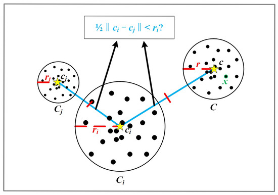Subsequently, the adjacent cluster of the query cluster is identified using Equation (8), and its center is added to the adjacent center set of . As illustrated in Figure 3, if half the distance between and is less than the radius , then is considered an adjacent cluster of . In contrast, if half the distance between and another cluster, C, exceeds , then C is not regarded as adjacent.