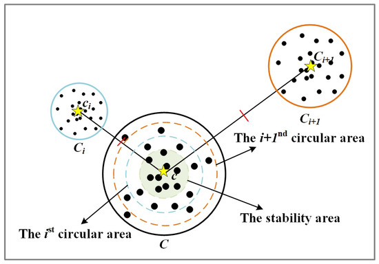 Figure 4 shows the stability area and the circular areas of the cluster C. From Equation (11) and Figure 4, it can be seen that data points in the i-th circular area of C are closer to the center c than to the center of the -th nearest cluster. Therefore, they can only be assigned within the query cluster C and its i nearest adjacent clusters.