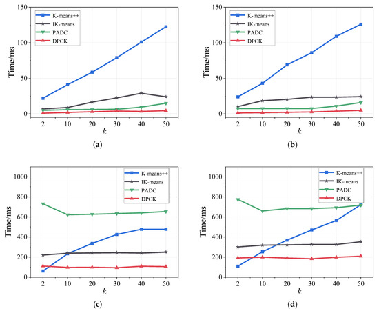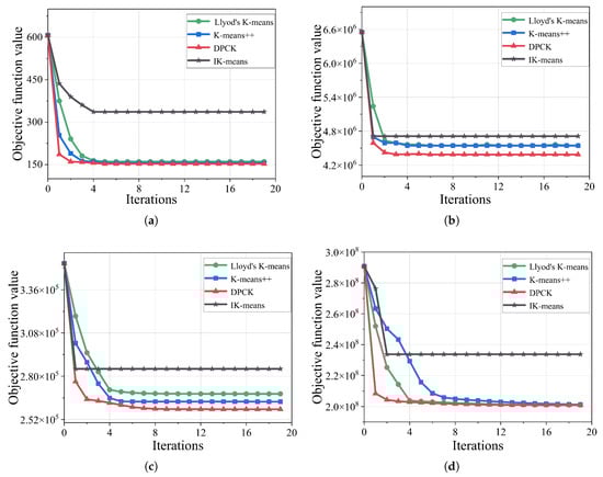 Figure 6 demonstrates the objective function values of methods in different iterations. The results of Figure 6a,b show that the convergence values of methods had small differences. The main reason is that the small-scale dataset involved fewer distance calculations, so the differences between the methods were subtle. However, the results of Figure 6c,d show that the initial convergence value of DPCK was significantly smaller than that of the other methods, and its convergence curve was more stable in relatively larger datasets. This is because our method no longer needed to compute the distance between all data points and the center points in subsequent iterations, which significantly improved the convergence speed and ensured more stable convergence.
