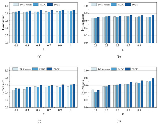 Figure 7 shows the F-measure of methods under different privacy budgets. As shown in Figure 7a,b, the DPCK scheme averaged 8.0% higher than the other schemes. The results in Figure 7c,d show that the DPCK scheme outperformed other methods by an average of 12%, and the advantage was more pronounced as increased in relatively larger datasets. Overall, under the same privacy protection conditions, DPCK achieved an average F-measure improvement of 11.3% over the baseline methods. The main reason for this is that in the DPCK scheme, the necessary privacy budget was calculated based on the distribution of data points in each cluster after each clustering iteration, allowing Laplace noise to be adaptively added. It prevented either insufficient or excessive privacy protection, maximally protecting user privacy while enhancing data availability.