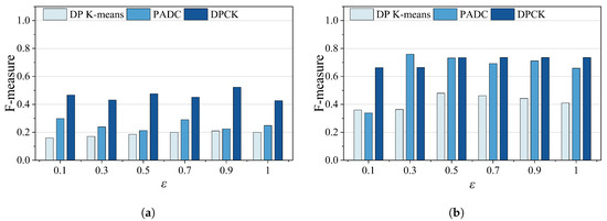 In this section, we will analyze the data availability by the calculated F-measure for the PADC mechanism, Differentially Private K-means (DP K-means), and the DPCK scheme on different datasets. Where the DP K-means is an algorithm that combines the K-means clustering algorithm with differential privacy techniques, it is used as a baseline method for DPCK to compare data availability. The privacy budget value gradually increased from 0.1 to 1.0. The larger the value was, the less the noise added was, resulting in lower data privacy and clustering results closer to the true results.