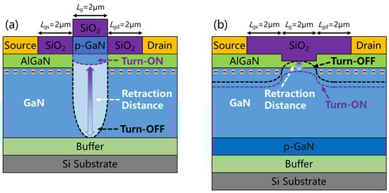 Device structures and operation principles of PTs with (a) capped and (b) buried p-GaN gate.